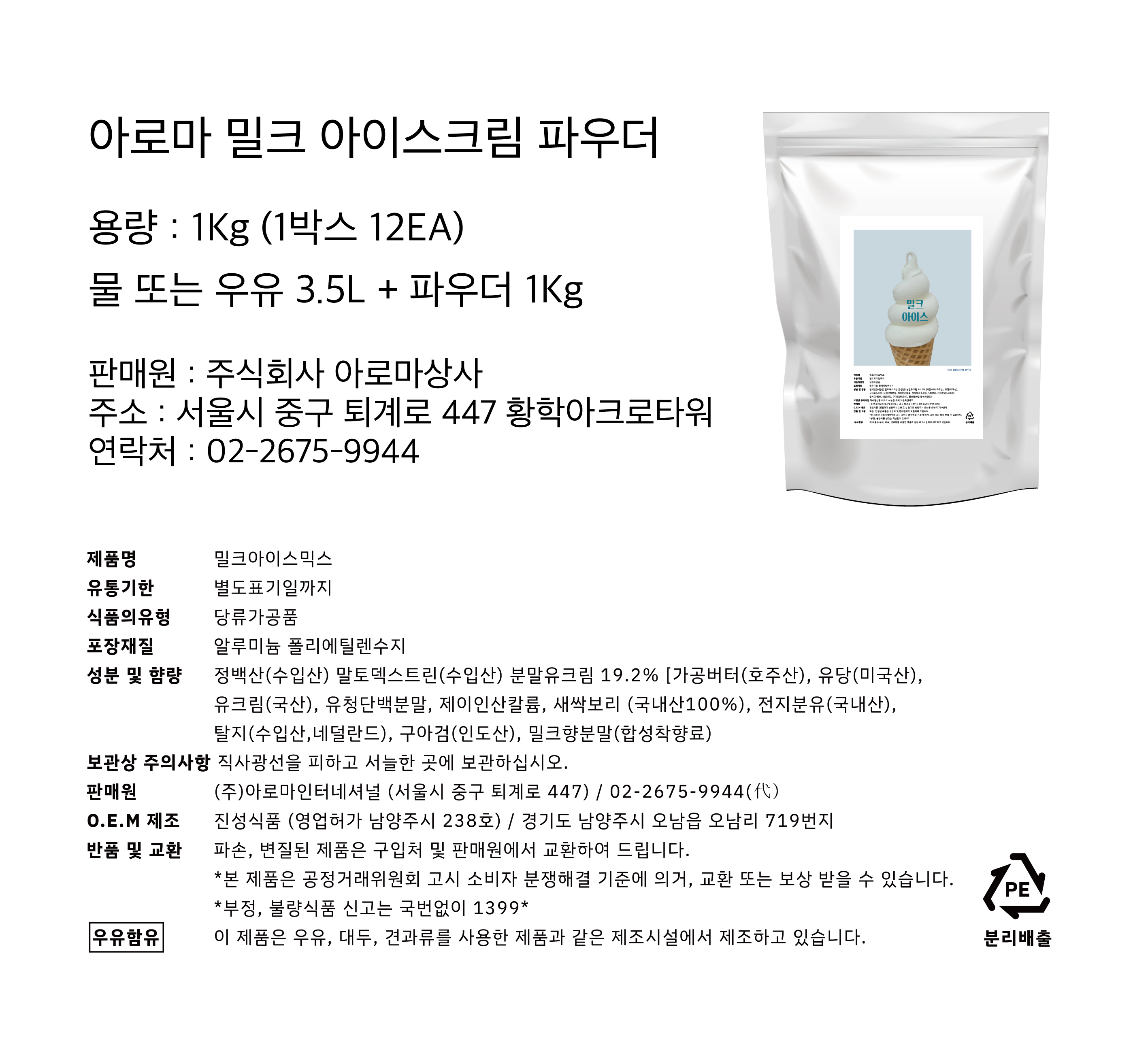 밀크아이스 파우더 아이스크림 분말 1KG / 1박스 12개입