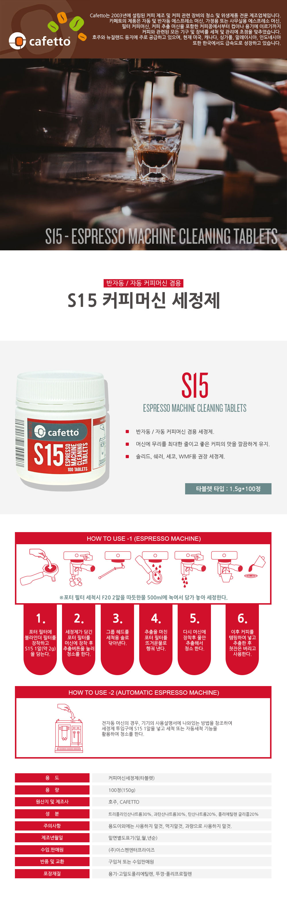 카페토 S15 커피머신 세정제 100EA Cafetto S15